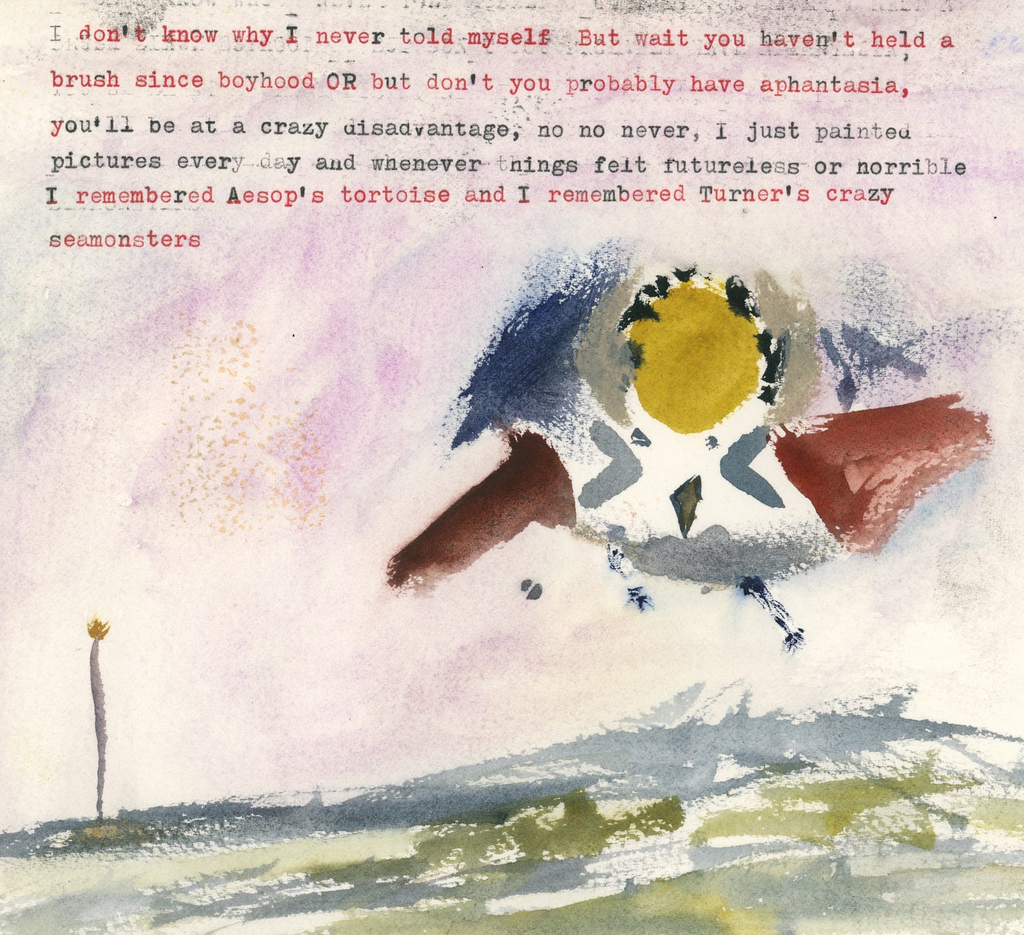 No no never! I only painted pictures every day, and whenever things felt futureless or horrible, I remembered Aesop’s tortoise and I remembered Turner’s crazy seamonsters, and the moral of this story, if you can call it that, is this: