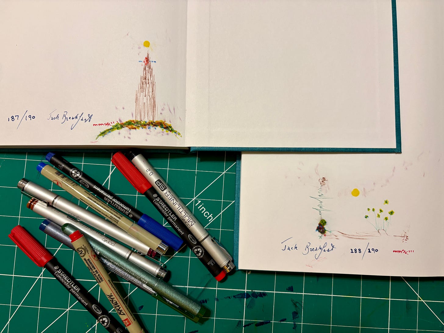 Also, in mmxxiii I published 190 copies of a hardcover artbook or artist’s book called We know the lights will go out but we don’t know when and as of today, only 2 copies remain! My fondest pastime is to corrupt the rearmost endpaper with a crude cartoon like this: